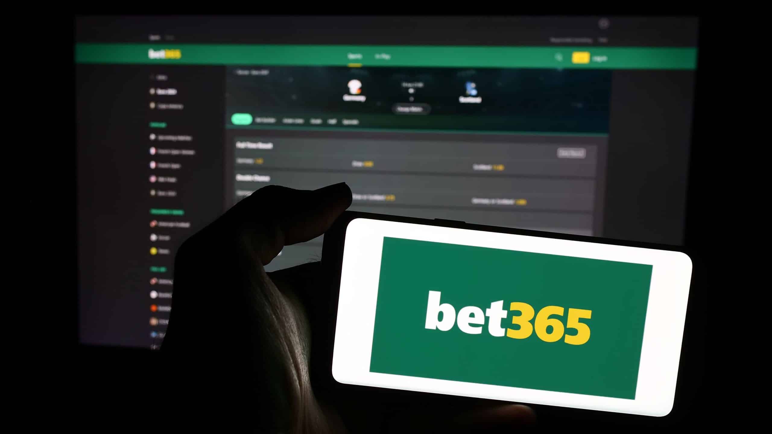2XBT8P1 Person holding mobile phone with logo of British sports betting company Bet365 in front of business web page. Focus on phone display.
